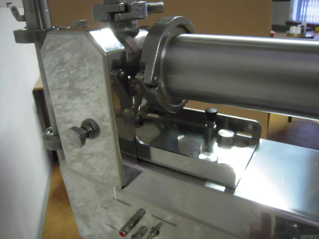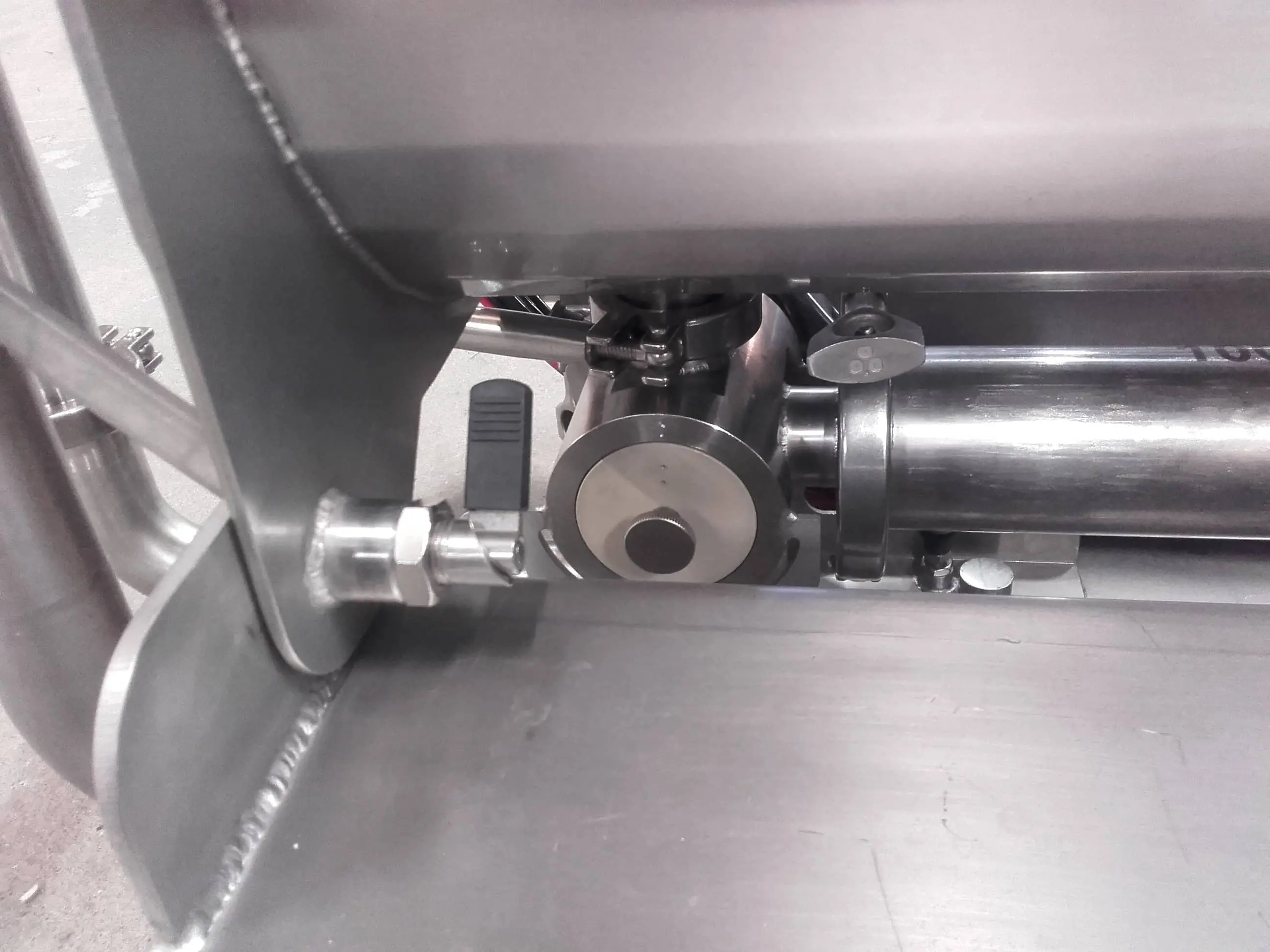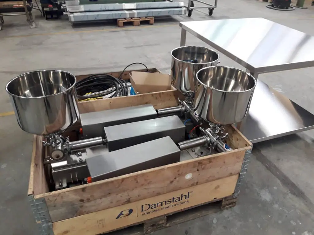 • Adskillelse og rengøring foregår meget hurtigt og enkelt, idet hele pumpe-arrangementet adskilles ved demontering af clampssamlinger. Der kan køres en CIP rengøring på fylderen. Pumpen kan leveres med mange forskellige optioner som f.eks. sugelanse, tragt, produkttilpasset fyldeventil mv.